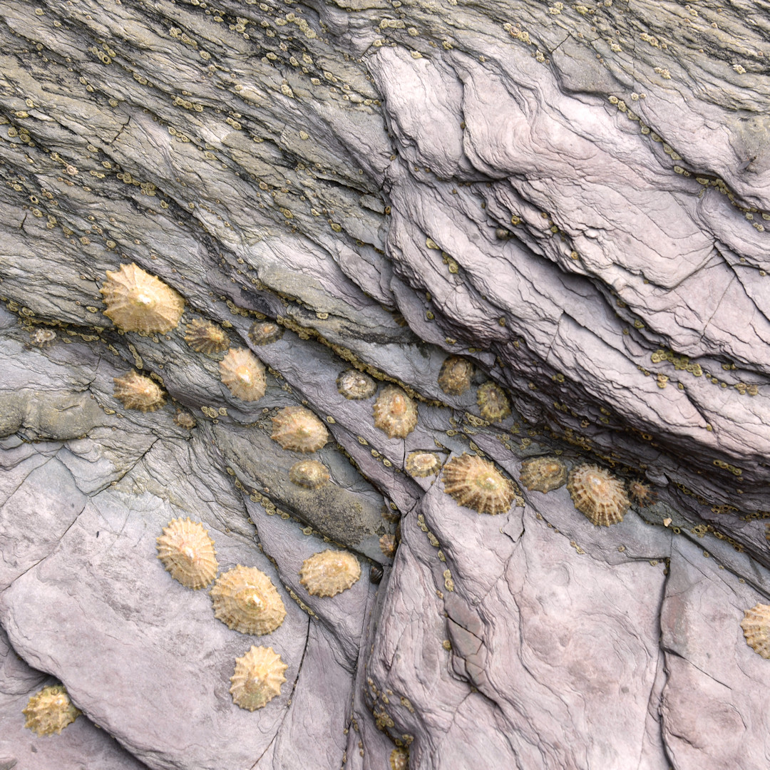 This part of the coast is made of Lower Devonian mudstones, siltstones and sandstones, in the most delicate shades of pink, green, blue-grey and orange, many with a lovely silvery sheen. Seaworn, the rocks display beautiful striations and streaks that I found very appealing.